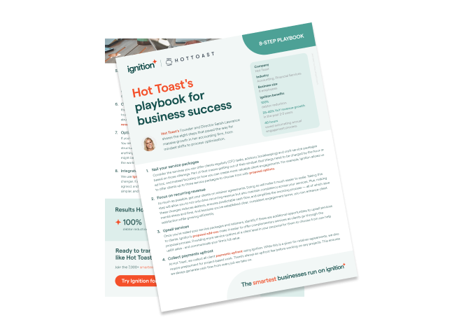 Ignition powers Hot Toast's client engagement workflows, making life easier for Sarah and the team. They don't have to deal with tedious admin work around proposals, engagement letters, and billing; instead, Ignition frees up their time and energy to focus on what they do best: offering end-to-end CFO solutions and maximising the firm's revenue.