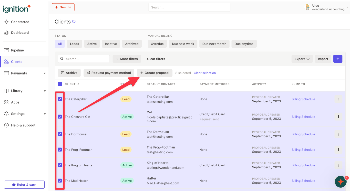 - Navigate to your Clients tab → Select the clients you wish to create the same proposal for → Create proposal and follow the prompts.
