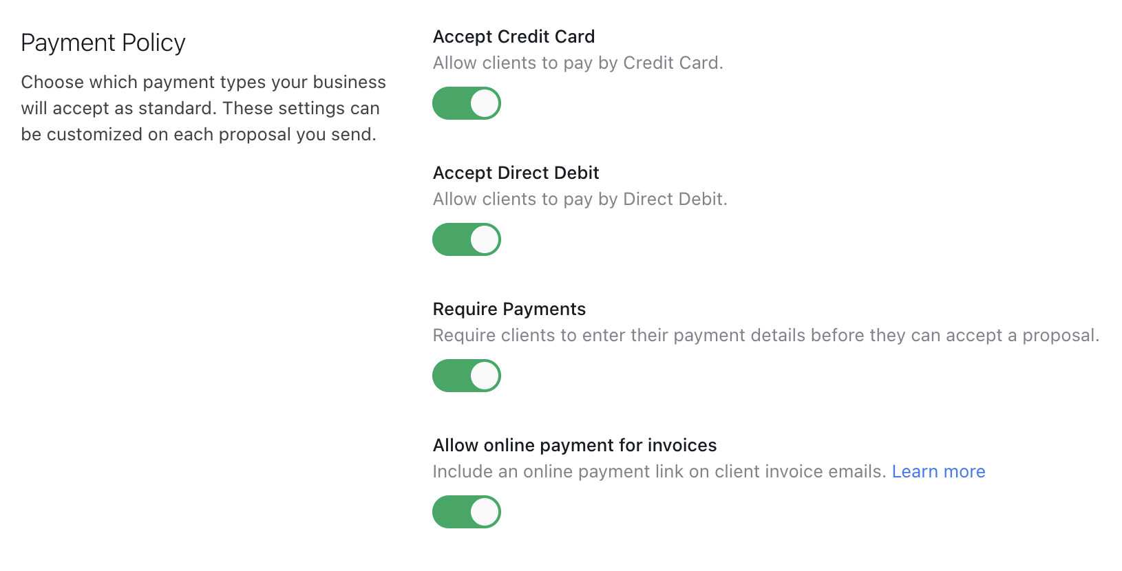 These set the default payment settings whenever you create a proposal, but they can be overridden at a proposal level.