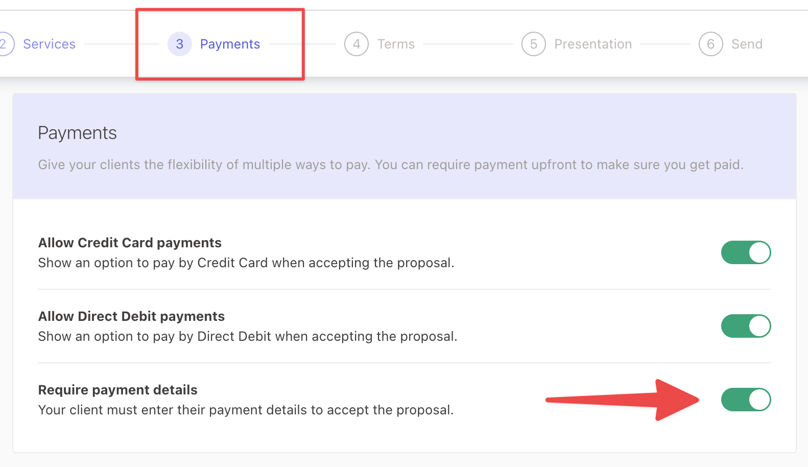 In each of your proposal templates, we strongly recommend that you enable the Require payment details toggle to ensure that you are collecting payment details upfront, to minimize your debtors.
