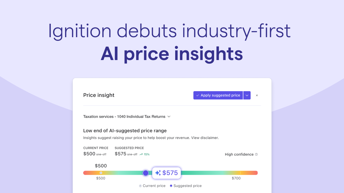 San Francisco, CA, October 1st — Ignition, the recurring revenue and billing automation platform for firms and agencies, today launched Price Insights, the accounting industry’s first AI-powered pricing intelligence solution. Drawing on Ignition’s robust proposal data, it delivers tailored pricing benchmarks and suggestions that give firms the clarity to price smarter, improve profitability, and optimize revenue.