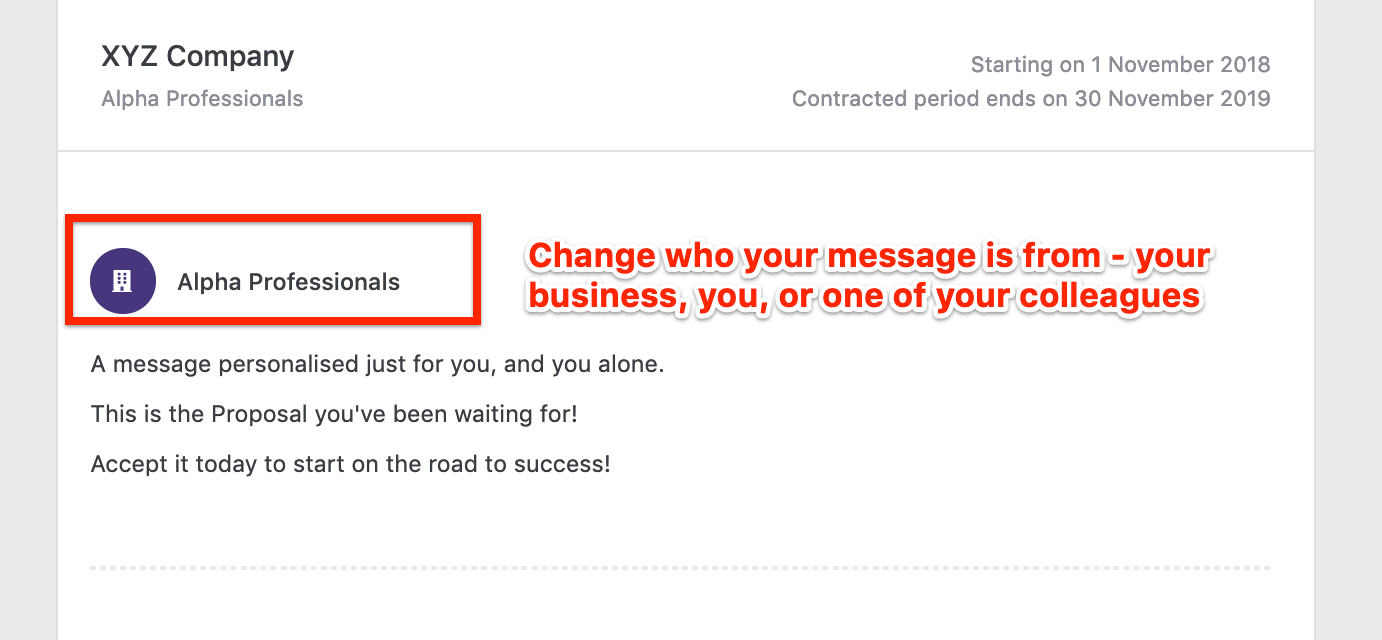 Based on your feedback, we have made some changes to allow you to select who the personal message appears from on your proposal. See how to change who your personal message appears from below: