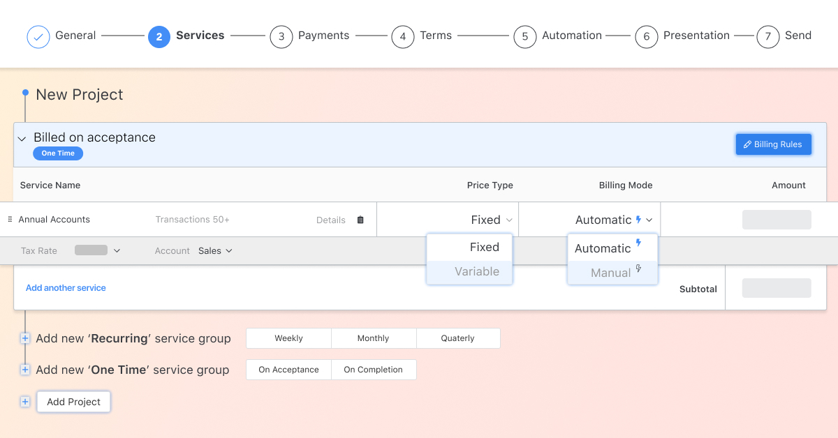 For example, if your firm has a client that employs a casual shift workforce that changes every month, you can now easily bill them using our new variable unit price type field - simply add the number of employees at the end of each month. If your firm is not ready to transition your clients to fixed fees, you can bill by the hour and simply invoice your billable hours at the end of each month using Ignition. Or, if you have a client that requires multiple services that need to be billed differently at different times of the year, you can create any combination of one-time or recurring billing types in a single proposal.